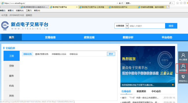 一、供应商登录:供应商注册审核通过之后,从系统首页地点击“会员登录”进入登录界面,输入账号密码登录进入投标报名页面,如下图所示