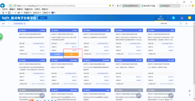 3. 如下图所示,显示无法投标,浏览器关闭,重新登录,在公告那边,点击“操作”,完善投标信息,并支付标书费