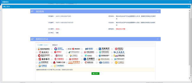 首先选择“个人网银(CFCA)”或者微信支付,若选择网银支付,则选择您的网银的银行,点击下一步,按照提示跳转到您的银行的支付页面。完成支付后即可下载招标文件。