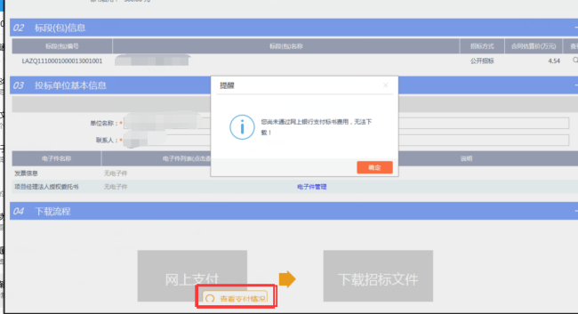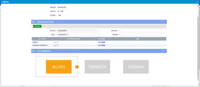 投标单位基本信息填写保存好之后,直接点击“网上支付”图标,进入标书费支付页面