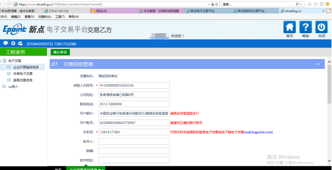 操作步骤:按照上述操作进入如下图所示界面,点击“工程业务-电子发票-企业开票基础信息”菜单,进入的页面。如下图: