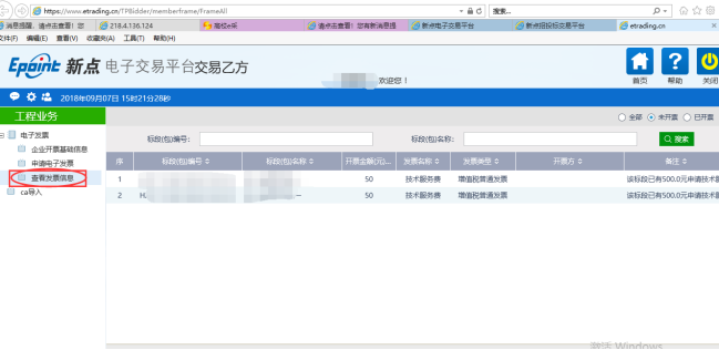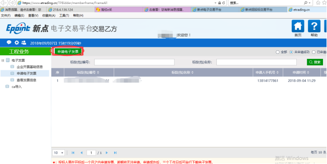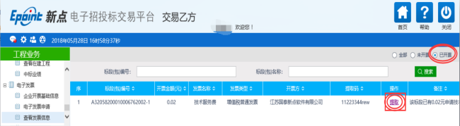 投标人点击图中的电子发票按钮,进入电子发票系统,如下图所示: