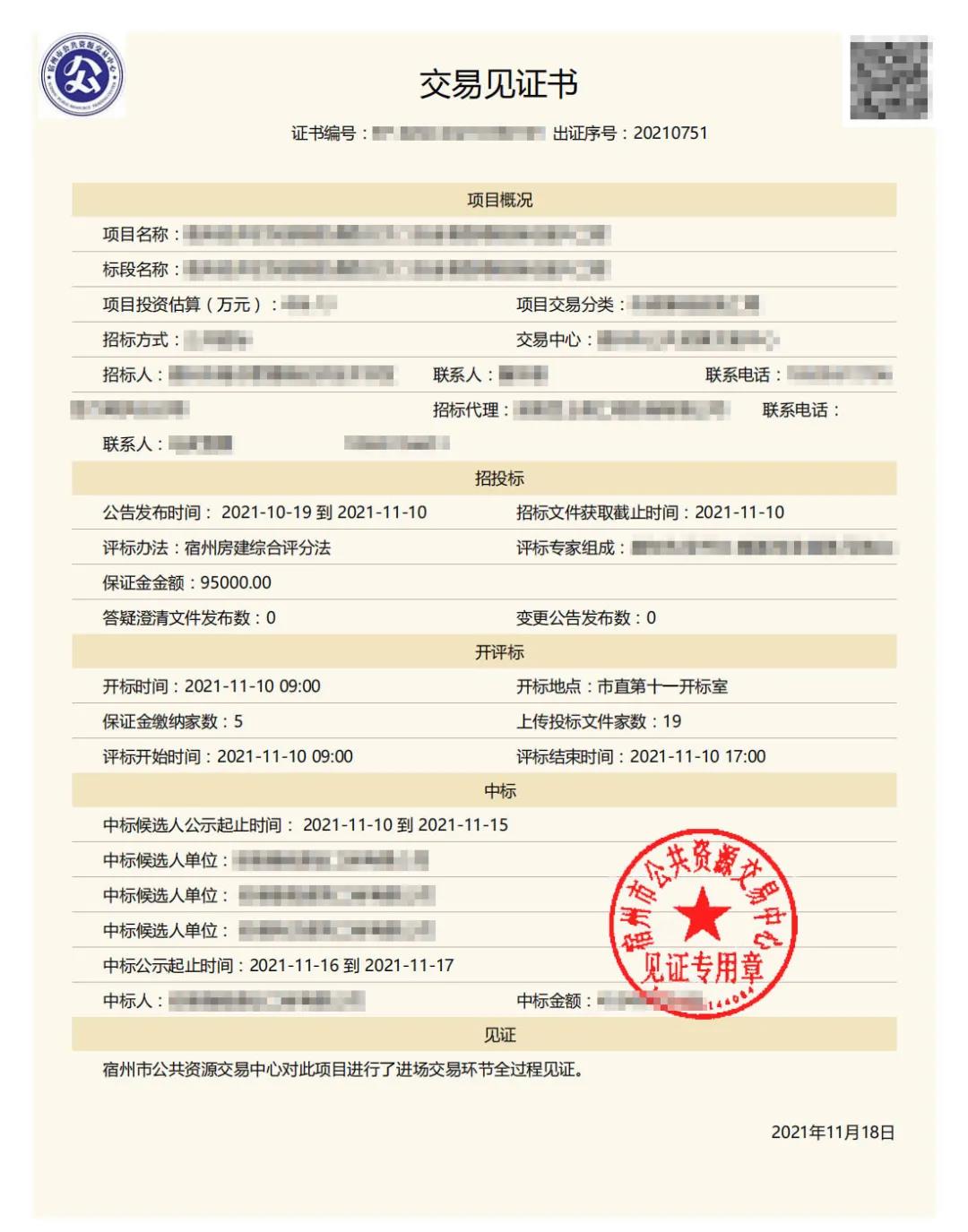 ▲项目交易见证书